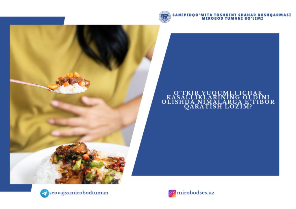 O‘tkir yuqumli ichak kasalliklaridan himoyalanish — har bir fuqaroning kundalik gigiyena madaniyati, oziqlanishga e’tibori va bolalar sog‘lig‘iga bo‘lgan g‘amxo‘rligidan boshlanadi. Yozgi mavsumda ushbu choralarni ko‘rish orqali oila a’zolarining salomatligini asrash mumkin.