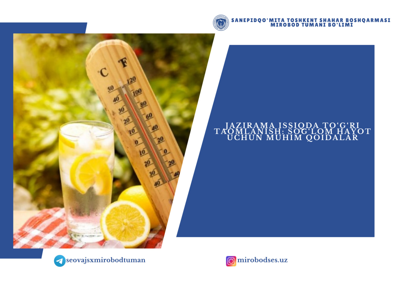 Issiq kunlarda to‘g‘ri ovqatlanish tanani sovutadi, suvsizlanishning oldini oladi va yozgi kasalliklardan asraydi. Ko‘proq suyuqlik iching, yengil ovqatlar tanlang, meva-sabzavotlar iste’molini ko‘paytiring — bu sog‘lom yoz garovidir!